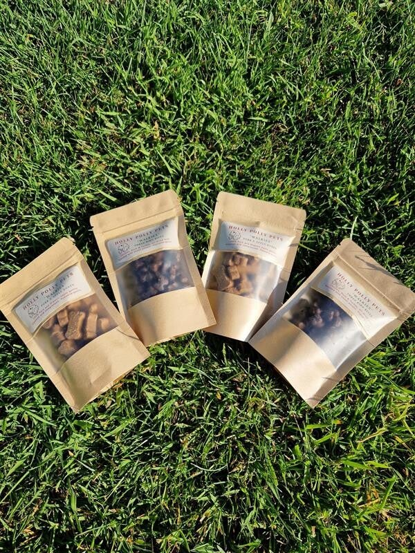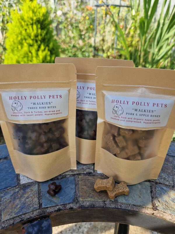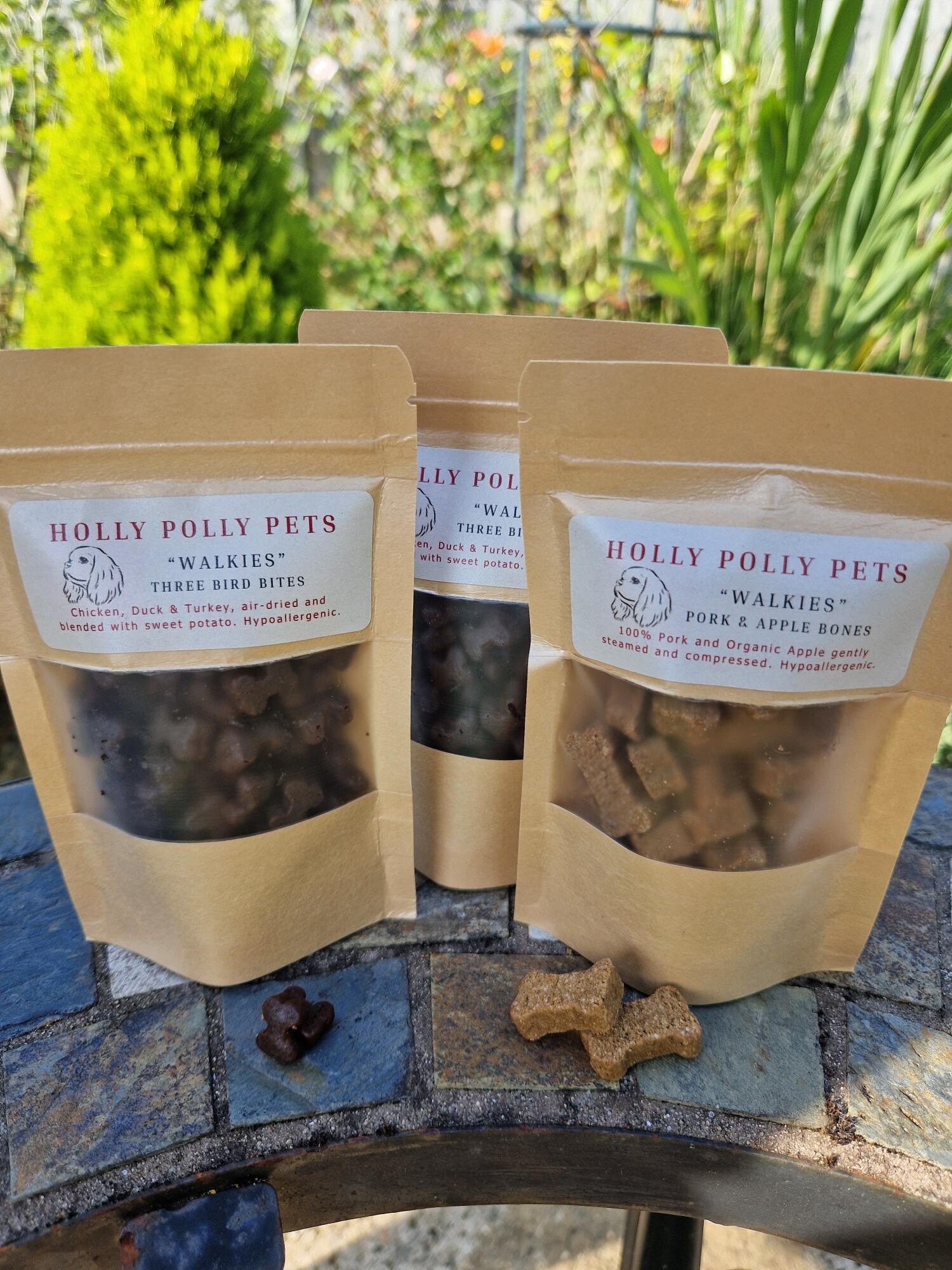 Our all natural pork and apple treats contain 100% pork meat with organic apples, all gently steamed and compressed into mini bone shaped rewards which are not only tasty, but perfect for training and dog walking.